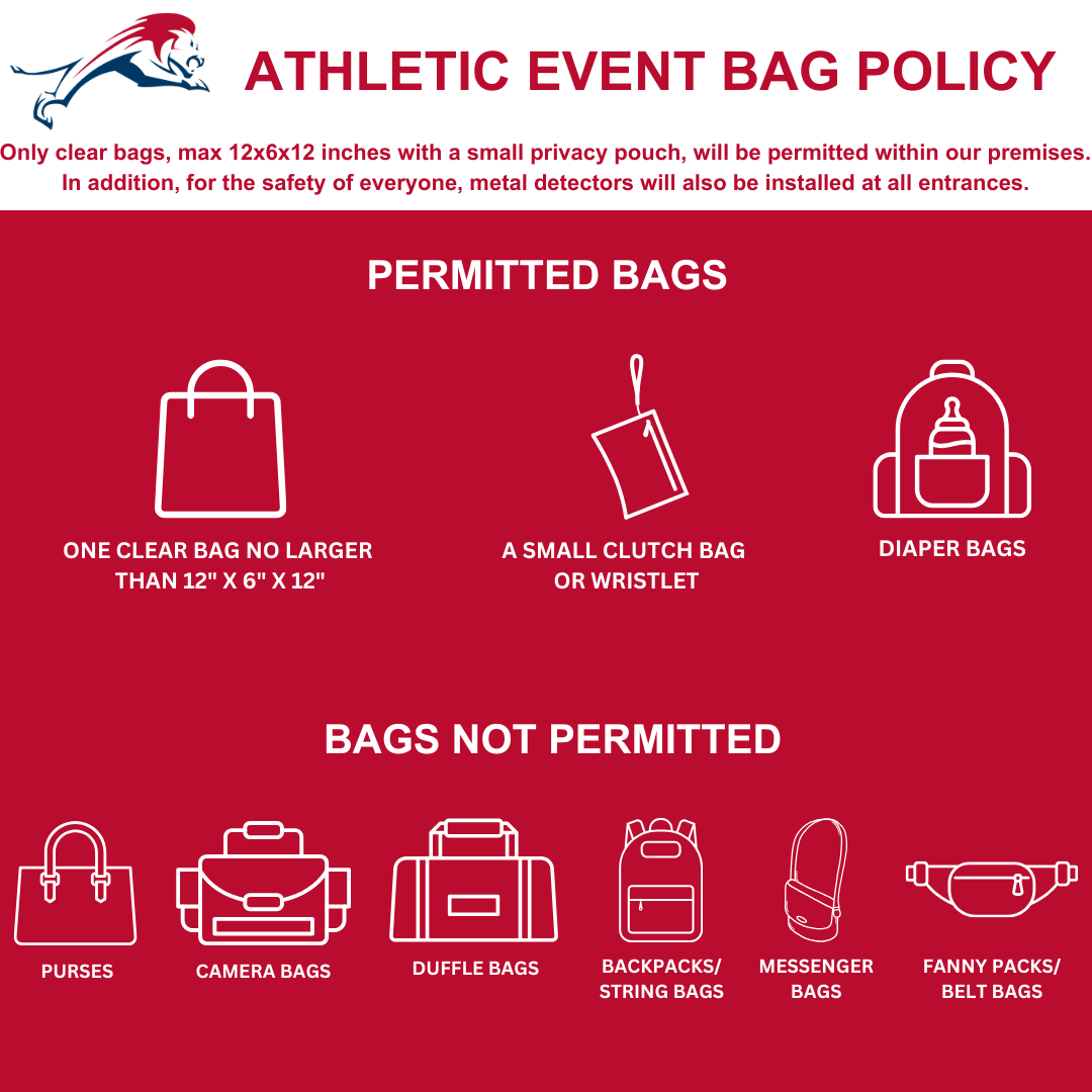 - Only clear bags (max size 12x6x12 inches) with a small privacy pouch are allowed. Click here for the full bag policy.