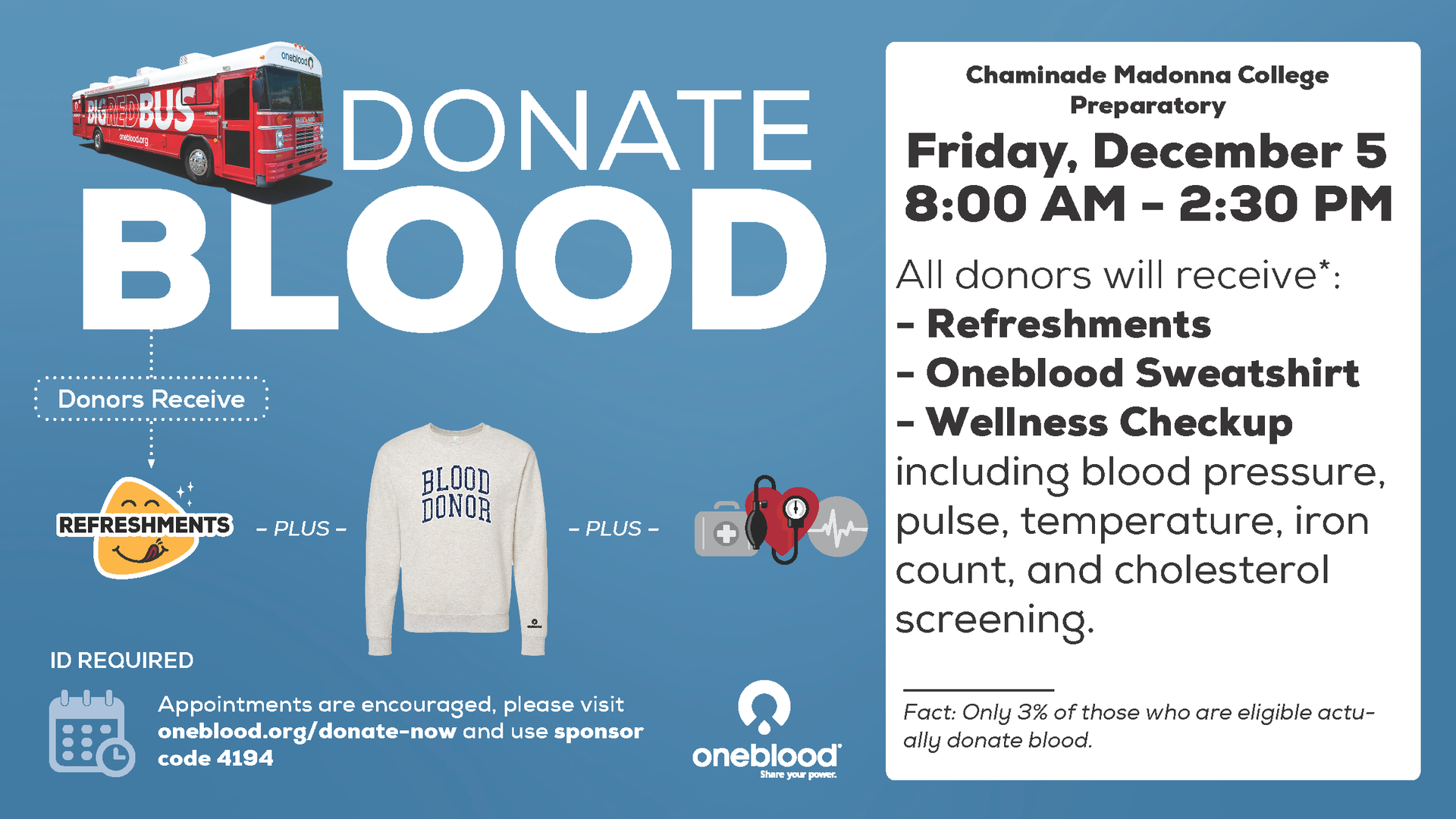 HOSA is sponsoring a Blood Drive on Friday, December 5, for students, faculty, and staff. Alumni and current parents are also welcome and must sign in at the front entrance security.