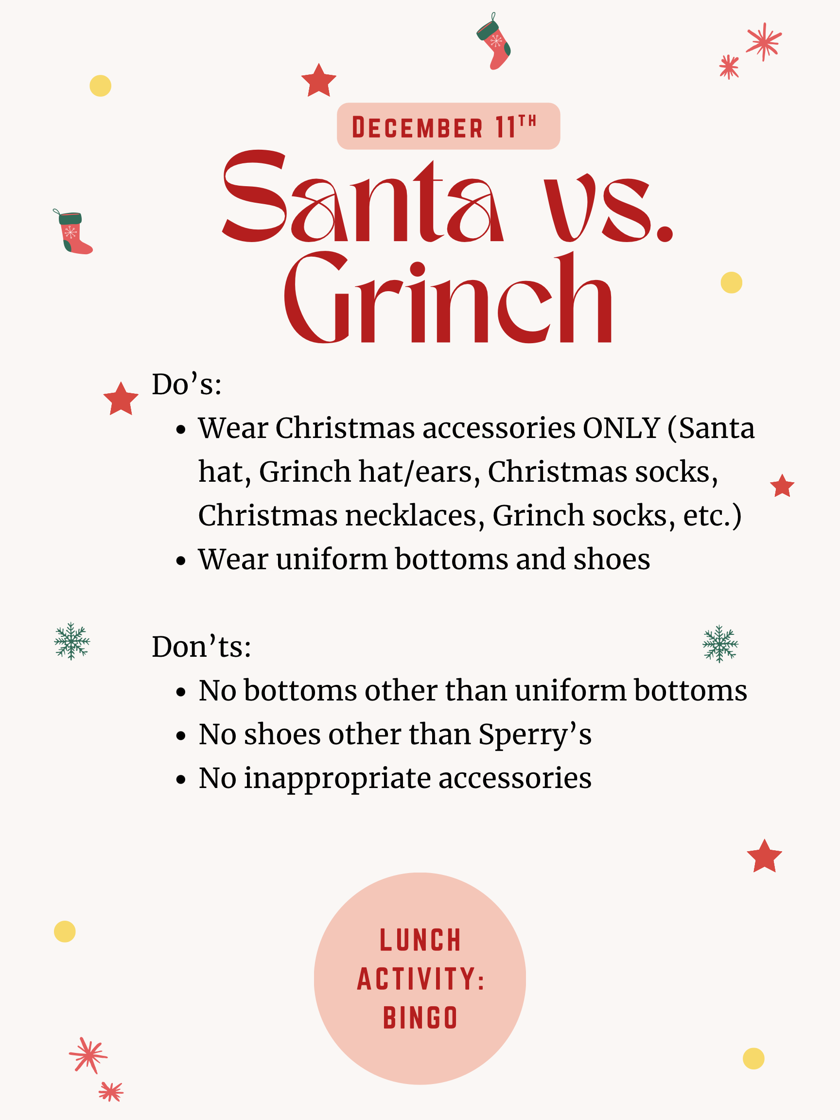 Thursday, 12/11 - Santa vs. Grinch Theme (with school uniform and school shoes), Lunch Activity: Christmas Bingo