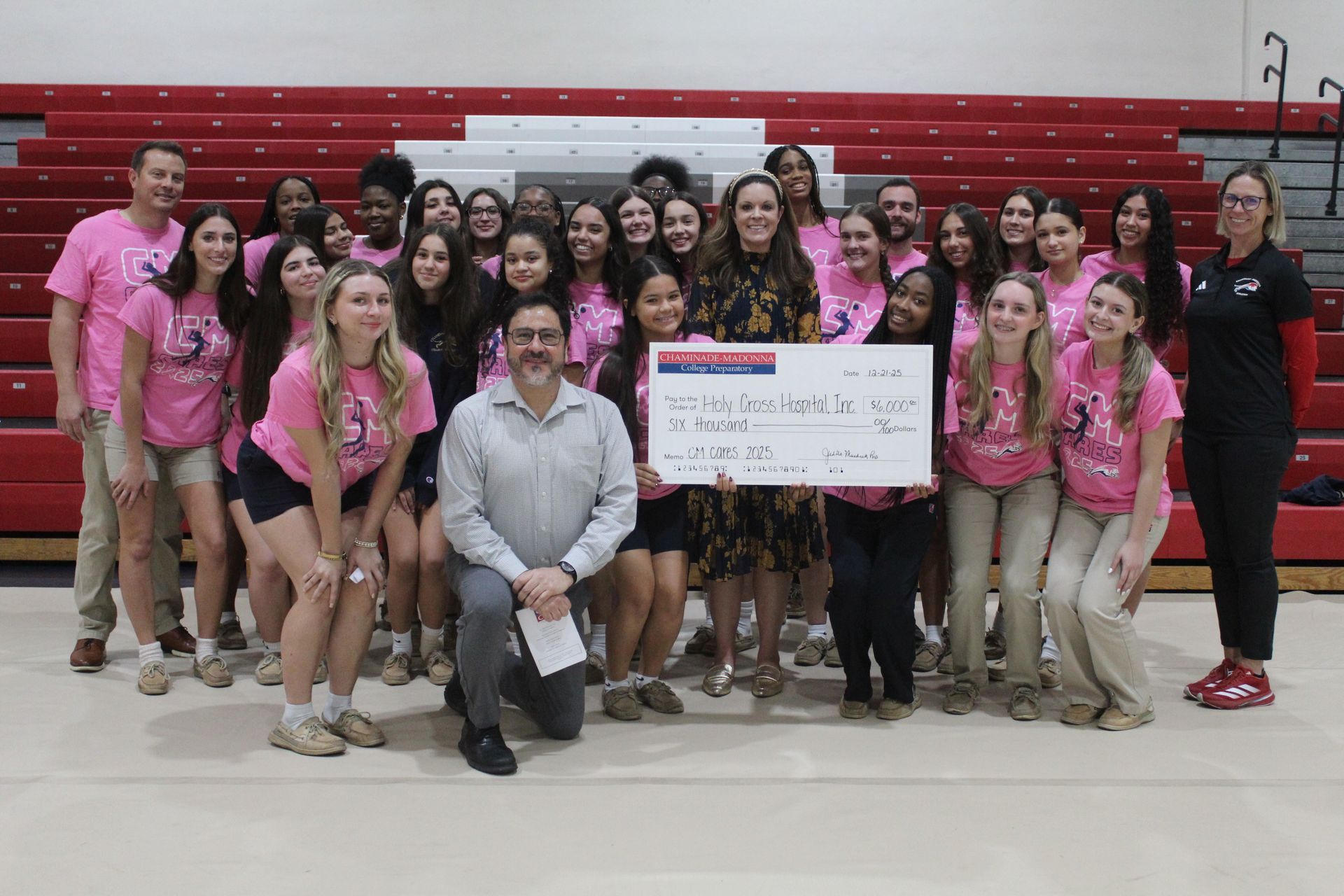 At the end of the prayer service, the Chaminade-Madonna College Preparatory Girls Volleyball team proudly presented a $6,000 check to Holy Cross Hospital designated to the Michael and Dianne Bienes Comprehensive Cancer Center. The check was presented to Brittany Henson, Holy Cross Health Development Officer, and Jorge Gitler, Executive Director of the Michael and Dianne Bienes Comprehensive Cancer Center.