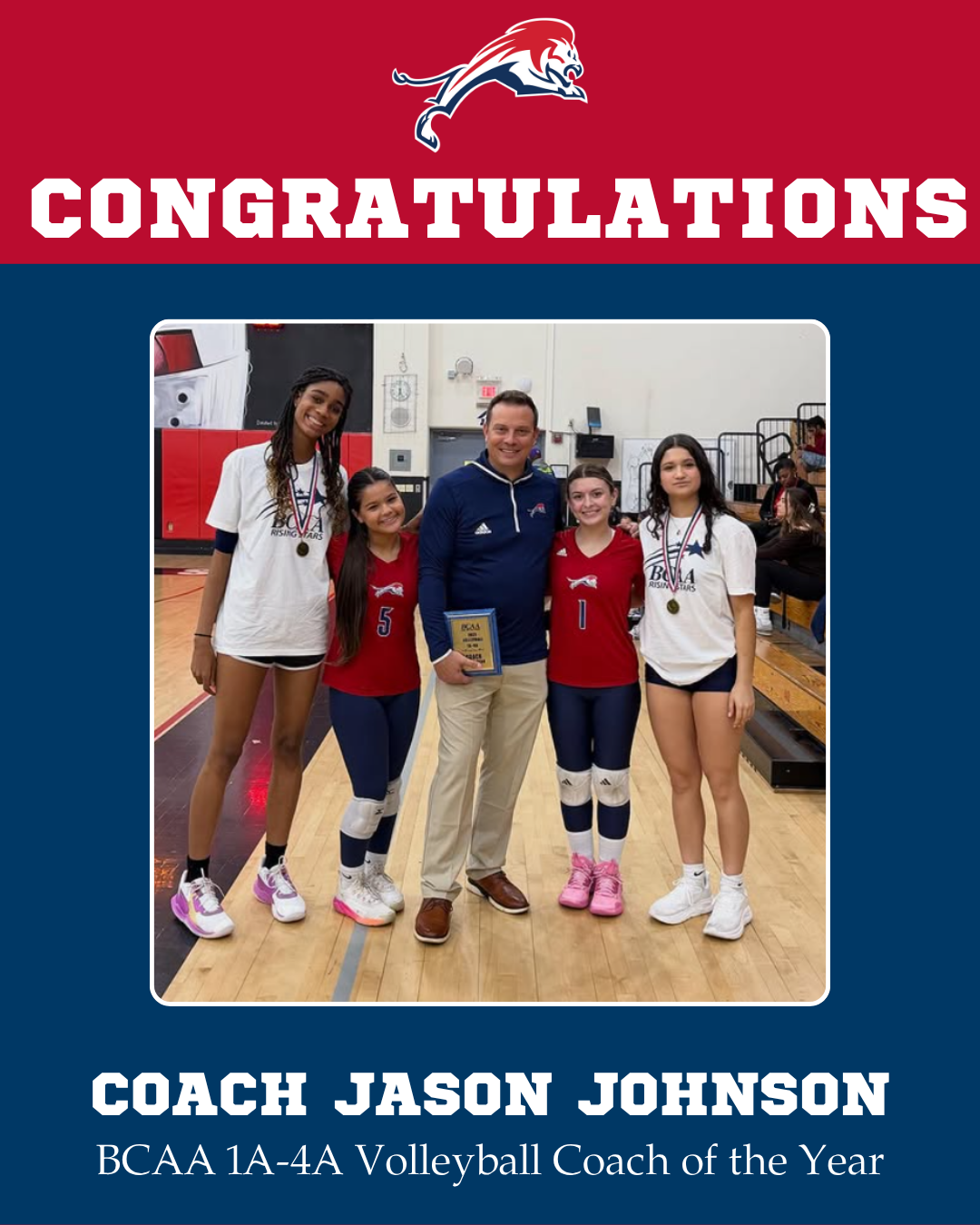 Congratulations to Coach Jason Johnson! On November 13 at the BCAA All-Star Volleyball Game, Coach Johnson was honored as the BCAA 1A -4A Volleyball Coach of the Year! This is an incredible achievement and a testament to his leadership, dedication, and the impact he continues to make on our student-athletes.