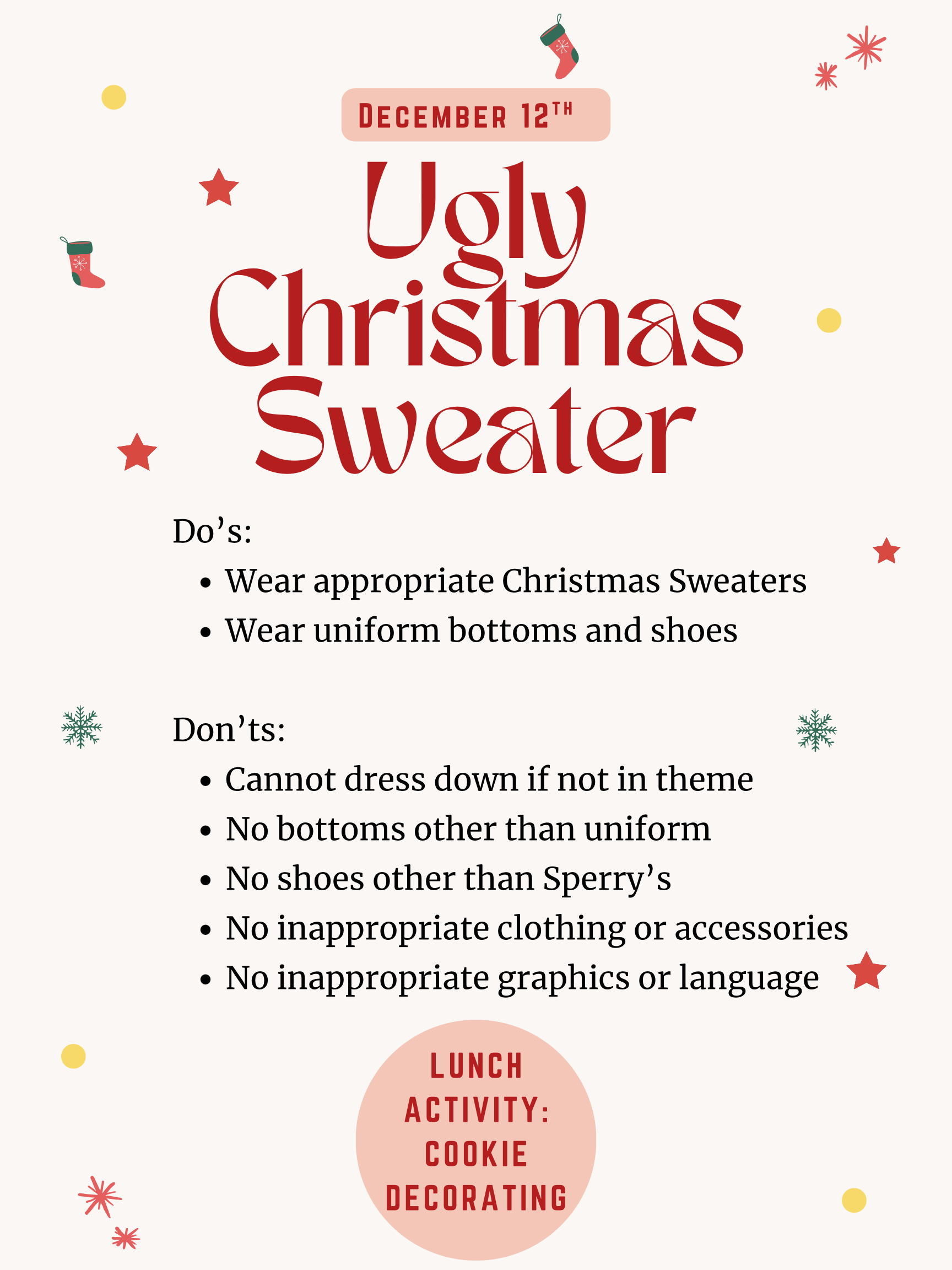 Friday, 12/12 - Ugly Sweater Day (with school uniform bottoms and school shoes), Lunch Activity: Cookie Decorating Competition & Christmas Music